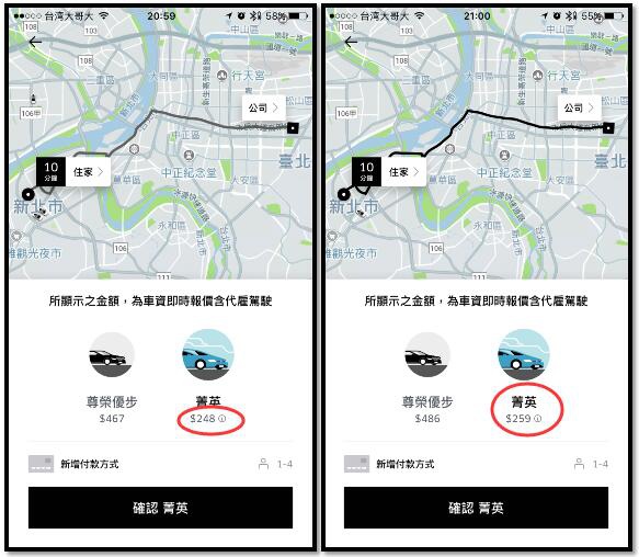只要刷完比搭小黃便宜或差不多,阿千應該就會訂車了!請看下圖~一樣的地方不同價錢(因為價錢是浮動的)