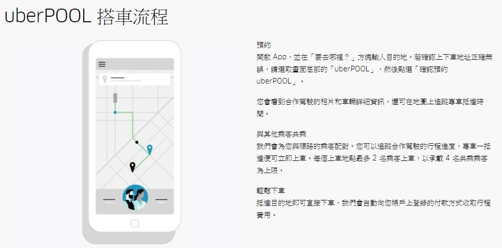 (4)另外Uer也可以使用共乘系統『uberPOOL』,也就是所有乘客一起分攤費用,可以看下方的使用說明
