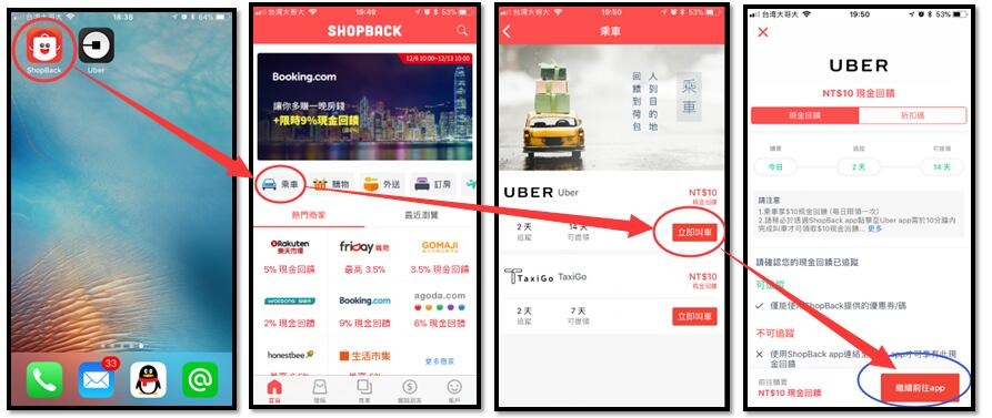 Step2. 註冊完後請下載SHOPBACK的APP,然後登入你剛才的帳號即可,首頁點『乘車』項目,由這裡連到Uber APP