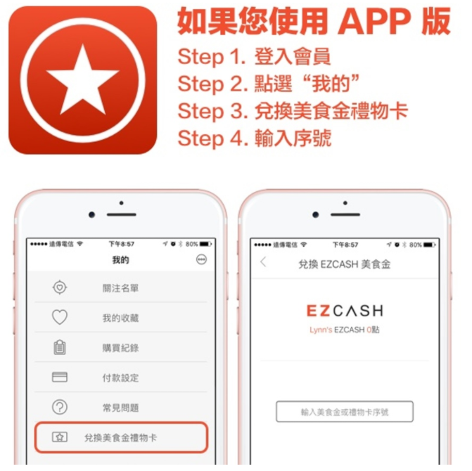 購買好的『美食禮物卡序號』可以Web兌換或app上兌換,APP方式如下!一般都會下載APP