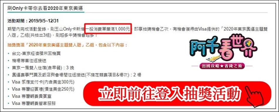 你有發現很多活動是一刷多賺?而且最強的是,你只要現在登入活動後!你所有的消費不論一般或指定的消費,只要單筆滿1000元就是享有一次抽獎機會,你將獲得信用卡國際組織Visa贊助的【2020年東京奧運主題雙人遊】,一共抽出三位得獎者!而且不止送機票和住宿,還超級豪華的給你Visa刷卡、迎賓禮,看奧運都是高級規格,天呀!我都好想去體驗看看,這是什麼樣的感覺!因為以前看信用卡組織最讚的就是專屬秘書,這獎項還管家耶!如果我有幸中獎我一定會好好寫體驗全程的感想,實在太夢幻了!