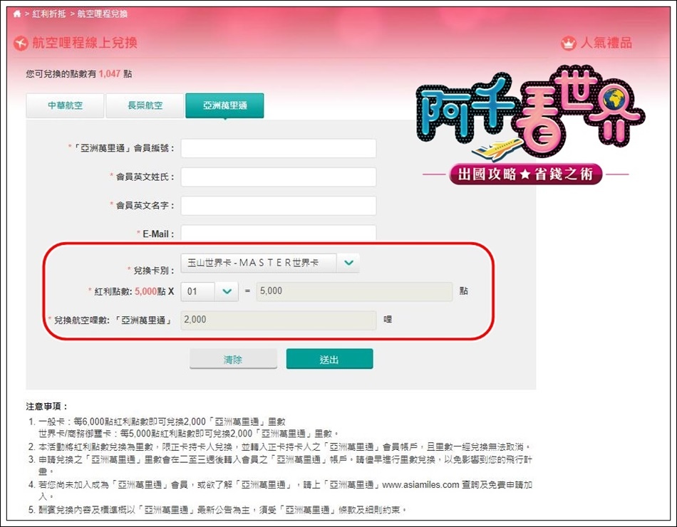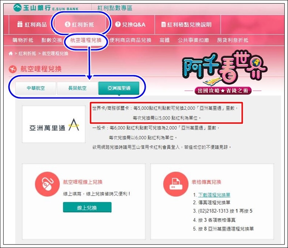 ◼ 哩稅兌換門檻每次以5000紅利為單位,可以兌換的有【中華航空、長榮航空、亞洲萬里通】這三個