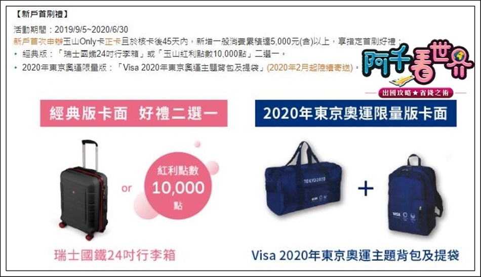 A13、是的沒錯!玉山一樣這次很大方給舊戶線上E指化申辦,核卡後45天累積消費到5000元就享有5000點紅利點數(等同現金500元),所以舊戶的你這10%回饋不拿嗎?而全新戶的你看要選那一種卡面,不同卡面的獎勵不同!如果你沒有很愛限量款的奧運包包和提袋,建議你申辦卡面可以選「經典款」你的首刷新戶禮就可以下方好禮二選一(看圖片),別忘了用下面這個推薦連結去線上申辦,你才會再拿到被推薦的3000點紅利點數(等同300現金回饋)