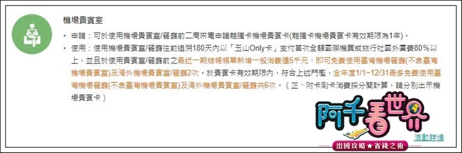 ❗ 也就是你刷廉航機票後(不論多少錢,反正只要80%),你接下來一定還要訂國外飯店吧,當然拿【玉山Only卡】順便訂房還享指定通路的紅利加倍外,你也等同完成了《最近一期結帳帳單新增一般消費達5千元》的條件,根本就是直接送你這次出國兩次進貴賓室的次數,但留意國內只能用餐廳國外才能用貴賓室或餐廳。