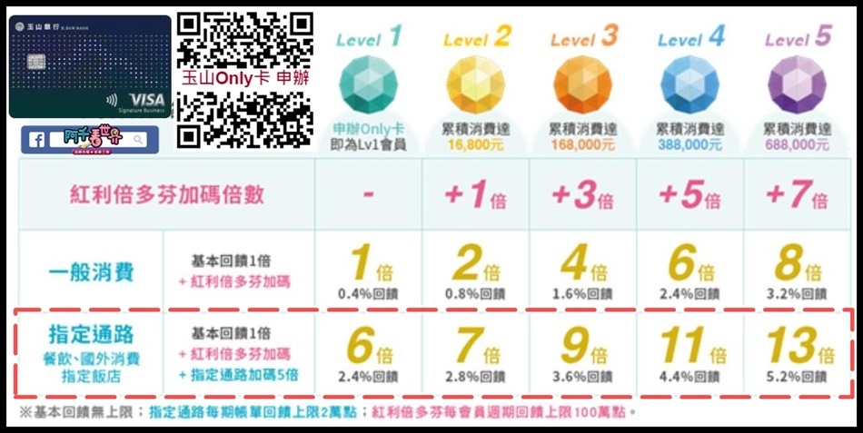 ⚫ 指定通路5倍紅利:每期帳單回饋上限2萬點,即每期你在指定通路上刷只能刷10萬元以內,超出後以一般計算