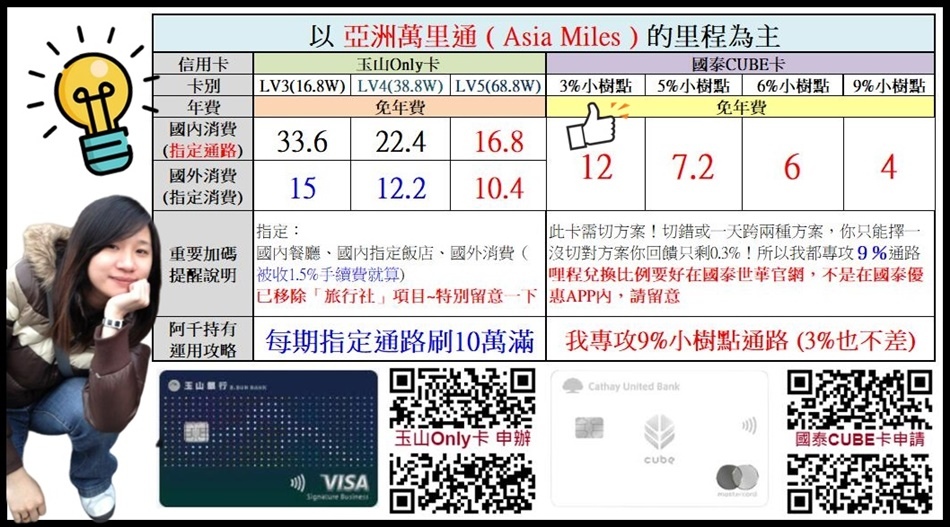 2022年「玉山Only卡」變成這個樣子!如果你真的在他的活動周期(一年)內刷不到68萬8千元,建議你可以不用再辛苦保住他了!而新朋友是否還值得申辦呢?我可能也不太推薦了!每年都會有卡上上下下,所以你只能每半年至少要檢視一下自己的用卡方式!像6/30和12/31都是很重要的日子,下方來你看完後自己決定還保不保這張,阿千在今年9月也放棄他降至LV2而已,因為我也轉向別在卡來保住我的哩程!他就是「國泰CUBE卡」3%小樹點無上限 = (12元 =1哩) 的成本,至高可到4元=1哩