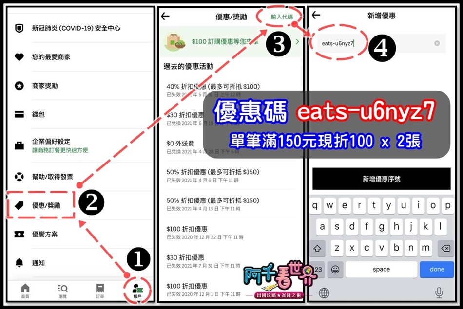 ✅ 在APP【帳戶→優惠/獎勵→右上角《輸入代碼》】內輸入【eats-u6nyz7】可以拿到兩張滿150元現折100元折抵券