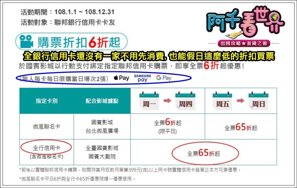 像iPhone手機11新機用這卡去買,你可以賺4%回饋,已經是超高的回饋方式還可以分期賺回饋!再來《聯邦賴點卡》你只要用ApplePay (AP)、GooglePay(GP)、三星Pay(SP)去國賓影城買票,不用消費簽單!平日享兩張65折,連假日也享兩張65折~沒錯!唯一假日可以有這麼便宜的電影票購買只有聯邦信用卡的這種支付活動!
