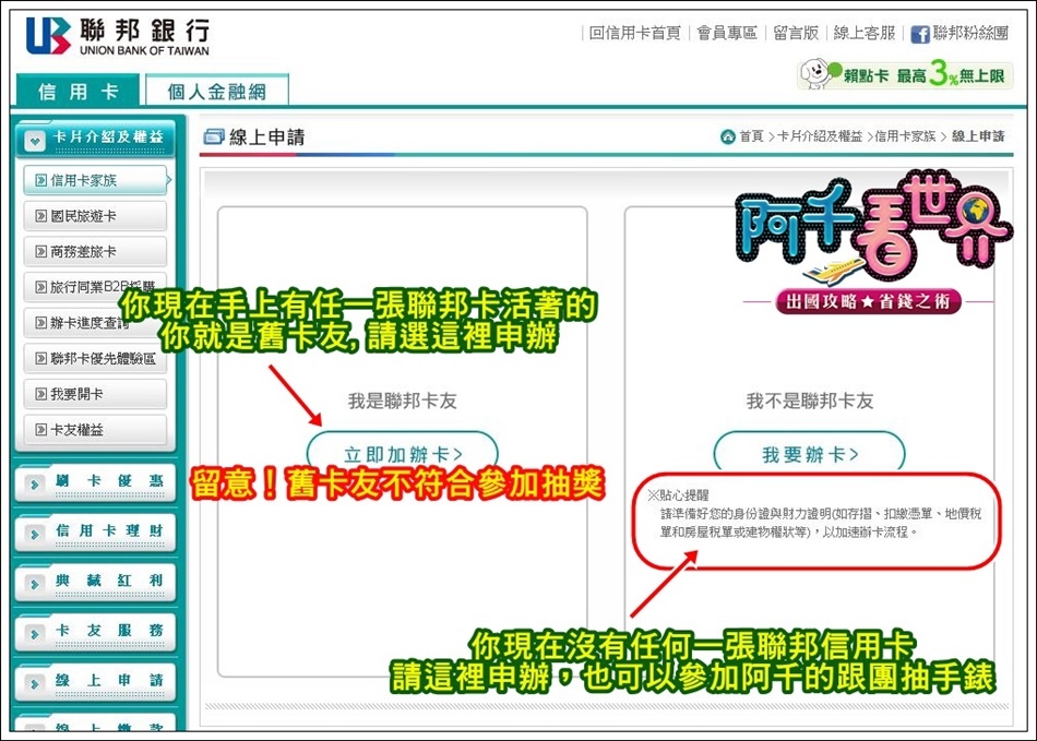 🍀 進入此頁請選擇你符合那種身份,全新卡友申請才符合抽獎,也請準備好相關資料做上傳,才能快速核卡!