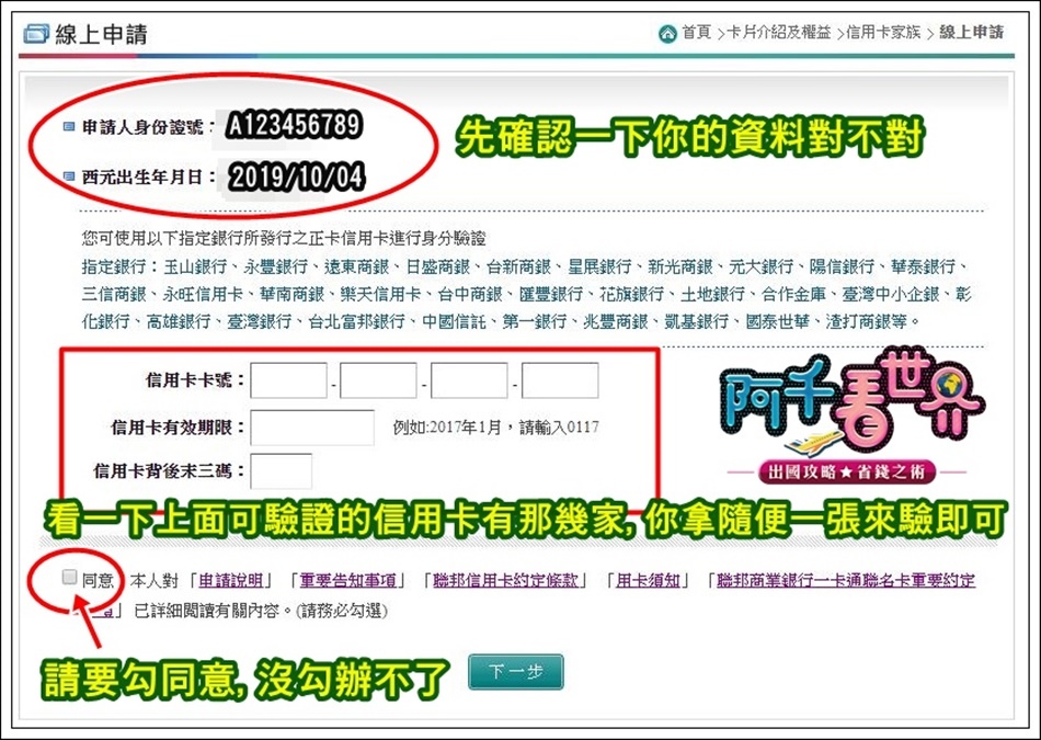 🍀 記得在驗證頁上確認自己的身份證和出生年月日是否正確,填好驗證的卡,下方要勾同意,再操作下一步