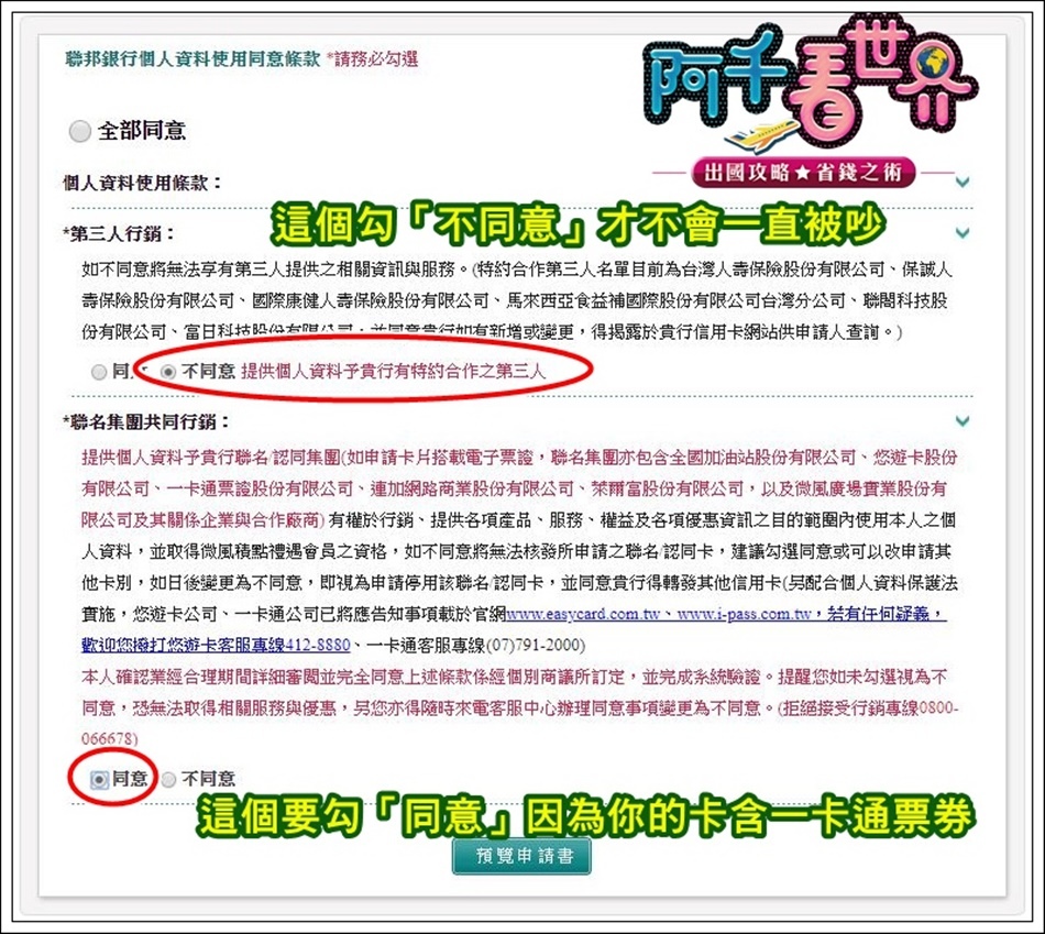 這些同不同意資料勾選,請把【第三人行銷】勾【不同意】,集團共同行銷的部份要勾【同意】,請自己看下圖!避免一直被電話行銷