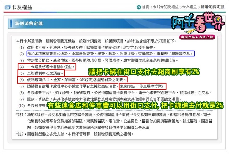 其實人家銀行頁面就清清楚楚寫給你看了!你以下這些地方的消費,通通沒有回饋!這些不止聯邦沒回饋,是全銀行的信用卡幾乎都沒有回饋,所以你可以改用《聯邦賴點卡》來刷,雖然沒有回饋但沒有關係,因為你只要控制這些沒回饋的消費,每月信用卡費用在2萬元以內,使用《LINEPay一卡通帳戶餘額》來繳費,就通通變成有2%回饋!這個叫做超強的bug回饋法,你想得到的沒回饋刷在這裡變卡費都變成有回饋!(猛爆了)