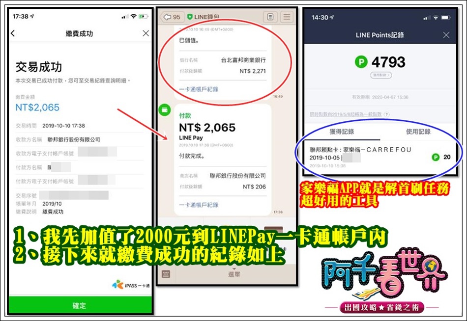 🔹 請先確認你的《LINEPay一卡通帳戶》餘額有大於你要繳付的錢,像我就是用富邦銀行加值了2000元